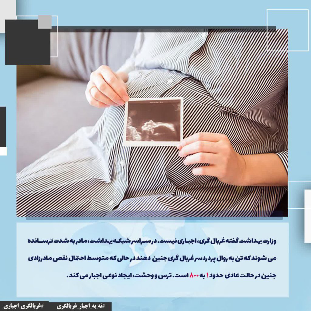 وزارت بهداشت گفته غربال گری، اجباری نیست. در سراسر شبکه بهداشت، مادر به شدت ترسانده می شوند که تن به روال پردردسر غربال گری جنین دهند در حالی که متوسط احتمال نقص مادرزادی جنین در حالت عادی حدود 1 به 800 است. ترس و وحشت، ایجاد نوعی اجبار می کند.