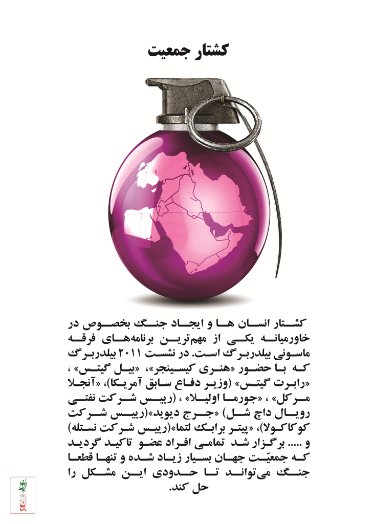 کشتار انسان ها و ایجاد جنگ بخصوص در خاورمیانه یکی از مهم ترین برنامه های فرقه ماسونی بیلدربرگ است. در نشست ۲۰۱۱ بیلدربرگ که با حضور «هنری کیسینجر»، «بیل گیتس»، «رابرت گیتس» (وزیر دفاع سابق آمریکا)، «آنجلا مرکل»، «جورما اولیلا» ، (رییس شرکت نفتی رویال داچ شل) «جرج دیوید» (رییس شرکت کوکا کولا)، «پیتر برابک لتما» (رییس شرکت نستله) و… برگزار شد تمامی افراد عضو تاکید گردید که جمعیت جهان بسیار زیاد شده و تنها قطعا جنگ می تواند تا حدودی این مشکل را حل کند.