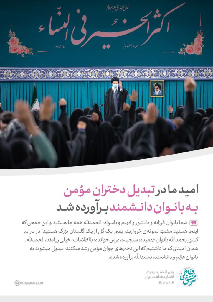 شما بانوان فرزانه و دانشور و فهیم و باسواد، الحمدلله همه جا هستید و این جمعی که اینجا هستید مشتِ نمونه خروارید، یعنی یک گل از یک گلستان بزرگ هستید؛ در سراسر کشور بحمدلله بانوان فهمیده، سنجیده، درس خوانده، با اطلاعات، خیلی زیادند، الحمدلله. همان امیدی که ما داشتیم که این دخترهای جوانِ مؤمن رشد می کنند، تبدیل می شوند به بانوان عالم و دانشمند، بحمد الله برآورده شده.