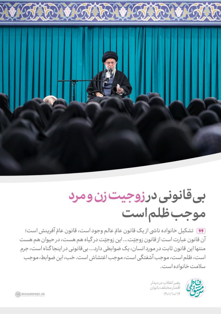 تشکیل خانواده ناشی از یک قانون عام عالم وجود است، قانون عام آفرینش است؛ آن قانون عبارت است از قانون زوجیت… این زوجیت در گیاه هم هست، در حیوان هم هست، منتها این قانون ثابت در مورد انسان یک ضوابطی دارد… بی قانونی در اینجا گناه است، جرم است، ظلم است، موجب آشفتگی است، موجب اغتشاش است. خب، این ضوابط، موجب سلامت خانواده است.
