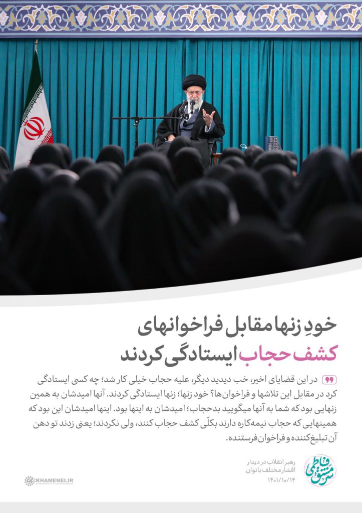 در این قضایای اخیر، خب دیدید دیگر، علیه حجاب خیلی کار شد؛ چه کسی ایستادگی کرد در مقابل این تلاش ها و فراخوان ها؟ خود زنها؛ زنها ایستادگی کردند. آنها امیدشان به همین زن هایی بود که شما به آنها می گویید بدحجاب؛ امیدشان به اینها بود. اینها امیدشان این بود که همین هایی که حجاب نیمه کاره دارند بکلّی کشف حجاب کنند، ولی نکردند؛ یعنی زدند تو دهن آن تبلیغ کننده و فراخوان فرستنده.